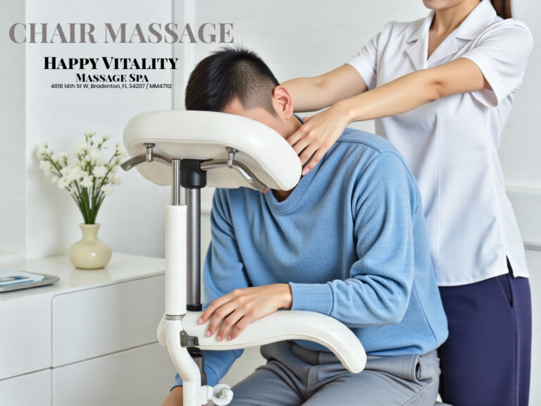 Chair massage delivers focused relief for the back, neck, and shoulders while you remain comfortably seated, making it a quick and effective way to reduce stress and boost energy.