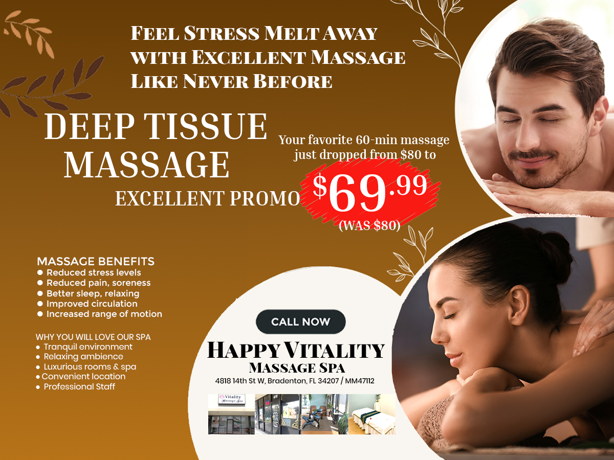 Enjoy our season promo on Thai Massage, Deep Tissue , and Couples Massage, available for a limited time only. Treat your body to focused relief and deep relaxation while this special offer lasts.